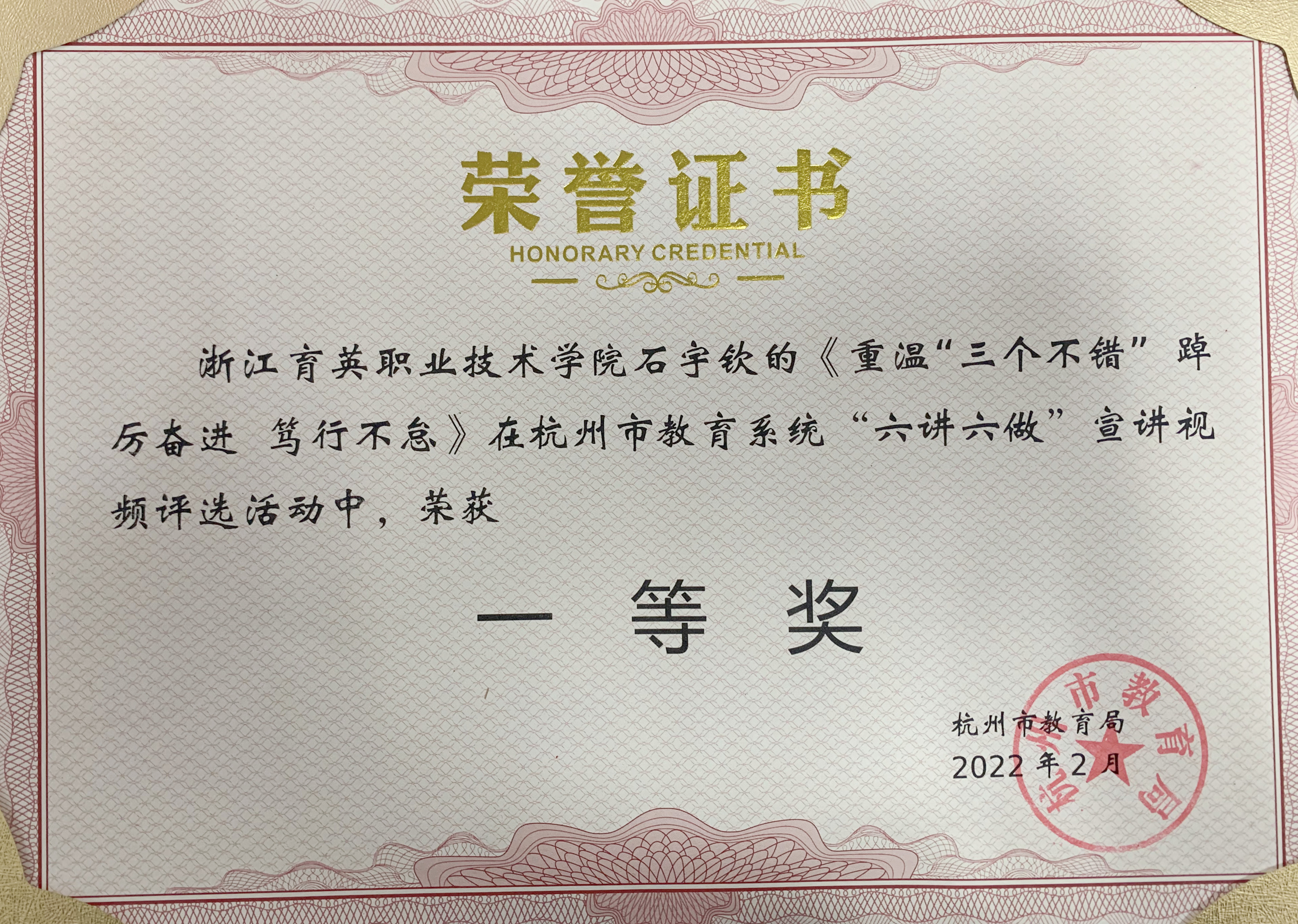 在杭州市教育局召开的教育系统党史学习教育总结暨2021年基层党建和人才工作述职评议会议中,我院荣获“百年党史暨党的十九届六中全会知识竞赛”高校教工团体三等奖等团体和个人荣誉6项,选送的《迎百年,访百人,忆百年峥嵘岁月--寻访百名老兵红色印迹》被评为杭州教育系统党史学习教育优秀案例。
