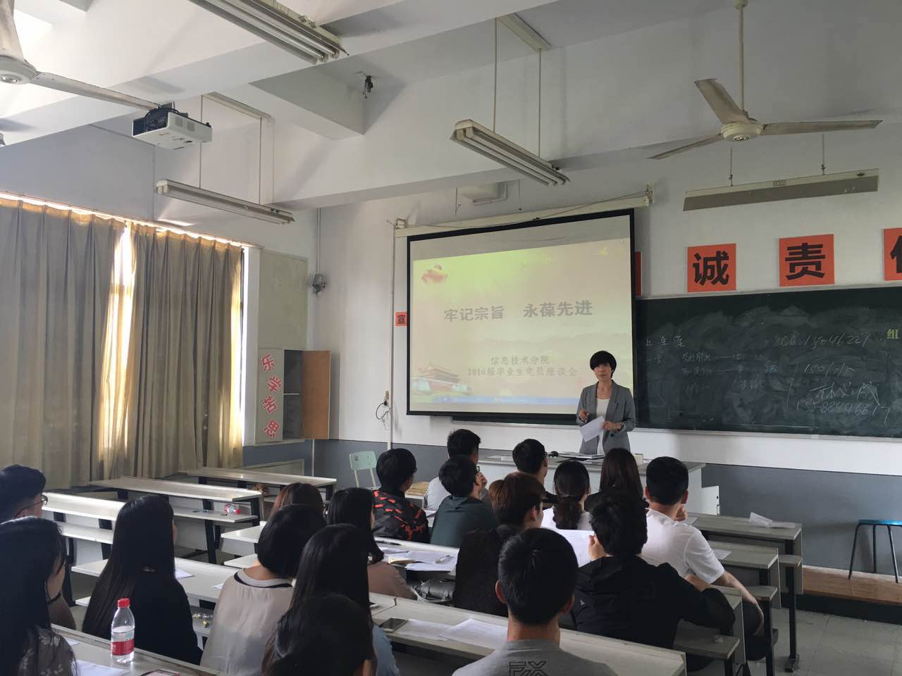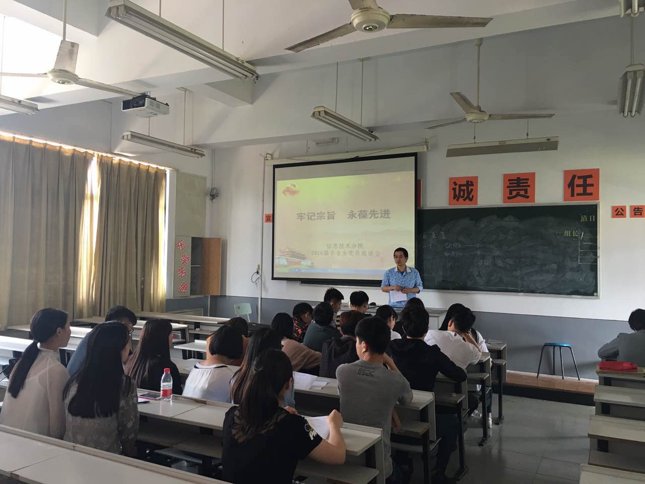 2016年5月17日中午,信息技术分院党总支在1505教室召开了主题为“牢记宗旨,永葆先进”的毕业生党员座谈会,党总支副书记罗妮娜,支部书记蒋玥、傅晶瑶,组织员林必成,以及分院2016届全体毕业生党员参加了座谈会。