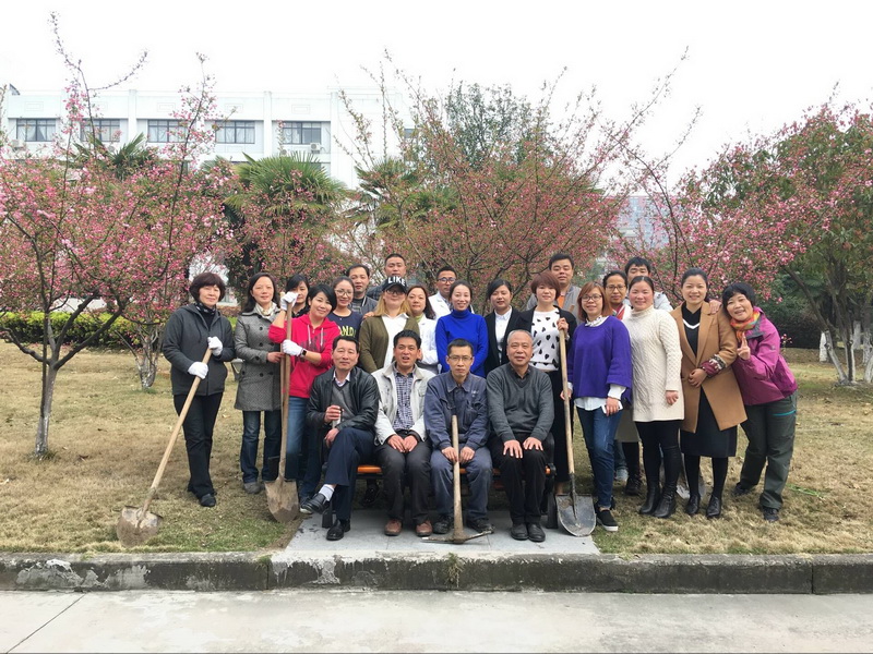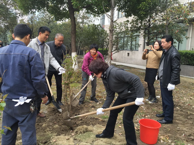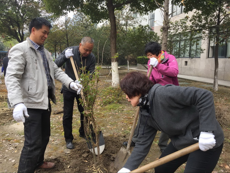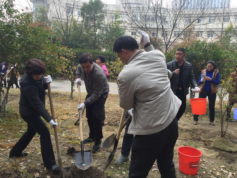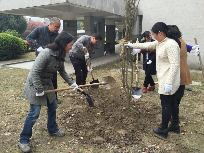 植树活动现场,党员和入党积极分子一起与同事们分工合作,齐心协力,按事先规划的种植区域,在三号楼南侧、一号楼南侧和图书馆东侧的绿地上共计种下樱桃、桔子、石榴等3个品种15株树木。每种下一棵树苗,大家都细心培实新土、堆起围堰、提桶浇水。通过近2个小时的劳动,一棵棵新栽的苗木迎风挺立,向我们传递着春的生机与活力。虽然大家鞋底、裤腿上全是泥土,但却满心欢喜。因为我们用实际行动绿化、美化了校园:十年树木、百年树人!通过每年一度的植树活动,我们为全院师生营造良好的学习、工作和生活环境,为保持生态平衡创造更好的条件。