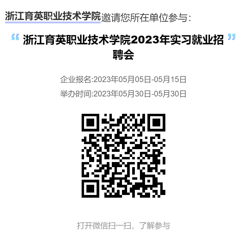 4.参会代表请于2023年5月30日8:30之前,到浙江育英职业技术学院招聘会接待处(学校体育馆入口处)报到,布展。