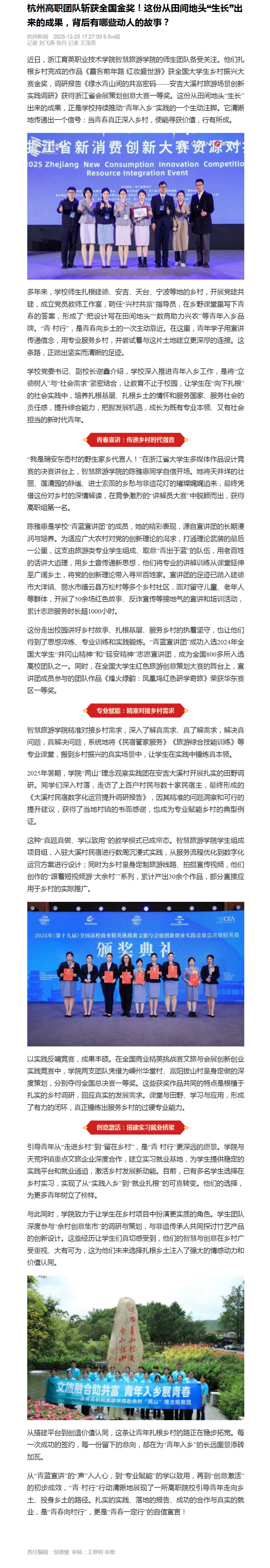近日,浙江育英职业技术学院星空彩票体育app平台的师生团队备受关注。他们扎根乡村完成的作品《霞客前年路 红妆盛世游》获全国大学生乡村振兴大赛金奖,调研报告《绿水青山间的共富密码——安吉大溪村旅游场景创新实践调研》获得浙江省会展策划创意大赛一等奖。这份从田间地头“生长”出来的成果,正是学校持续推动“青年入乡”实践的一个生动注脚。它清晰地传递出一个信号:当青春真正深入乡村,便能寻获价值,行有所成。