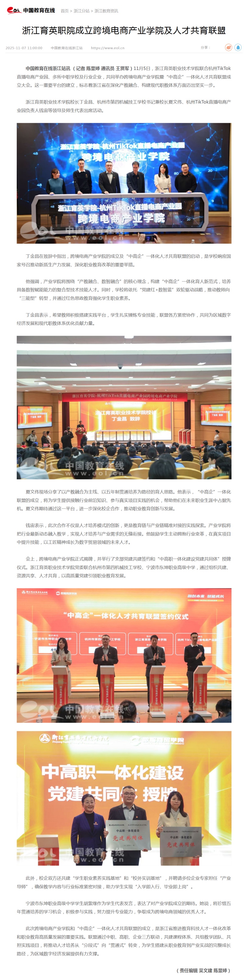 星空国际游戏厅浙江站讯 (记者 陈显婷 通讯员 王贤军)11月5日,浙江育英职业技术学院联合杭州TikTok直播电商产业园、多所中职学校及行业企业,共同举办跨境电商产业学院暨“中高企”一体化人才共育联盟成立大会。这一重要平台的建立,标志着浙江省在深化产教融合、构建现代职教体系方面迈出坚实一步。