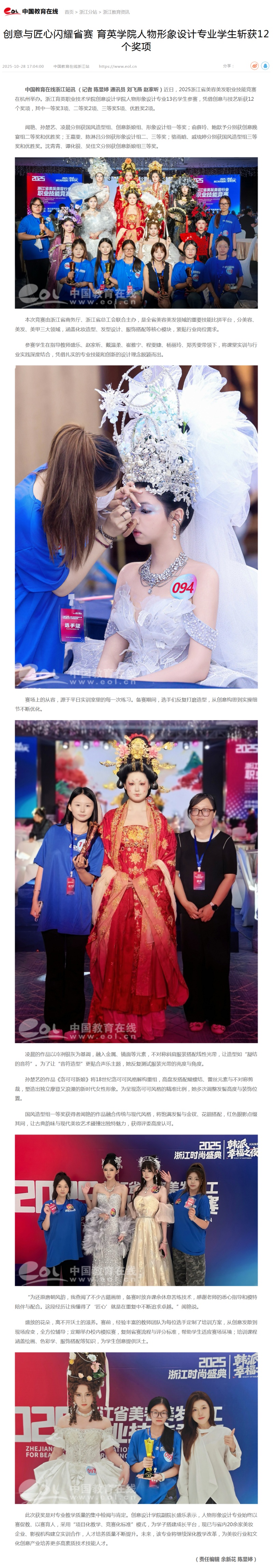 星空国际游戏厅浙江站讯 (记者 陈显婷 通讯员 刘飞燕 赵家昕)近日,2025浙江省美容美发职业技能竞赛在杭州举办。浙江育英职业技术学院创意设计学院人物形象设计专业13名学生参赛,凭借创意与技艺斩获12个奖项,其中一等奖3项、二等奖2项、三等奖5项、优胜奖2项。