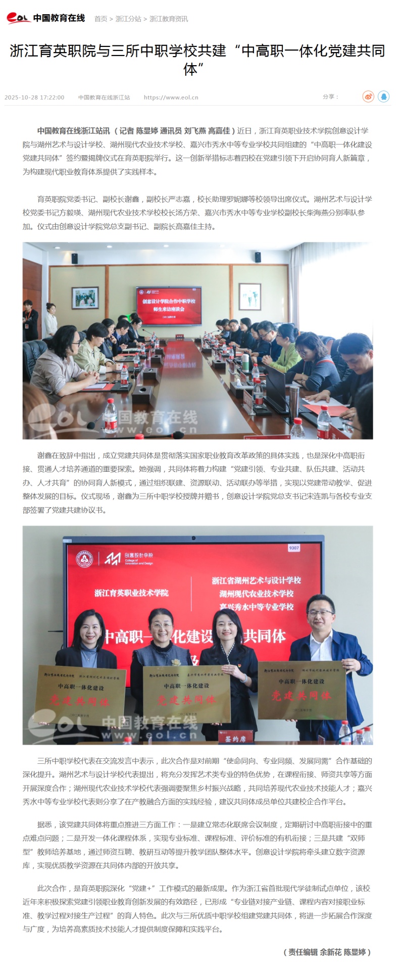 据悉,该党建共同体将重点推进三方面工作:一是建立常态化联席会议制度,定期研讨中高职衔接中的重点难点问题;二是开发一体化课程体系,实现专业标准、课程标准、评价标准的有机衔接;三是共建“双师型”教师培养基地,通过师资互聘、教研互动等提升教学团队整体水平。创意设计学院将牵头建立数字资源库,实现优质教学资源在共同体内部的开放共享。