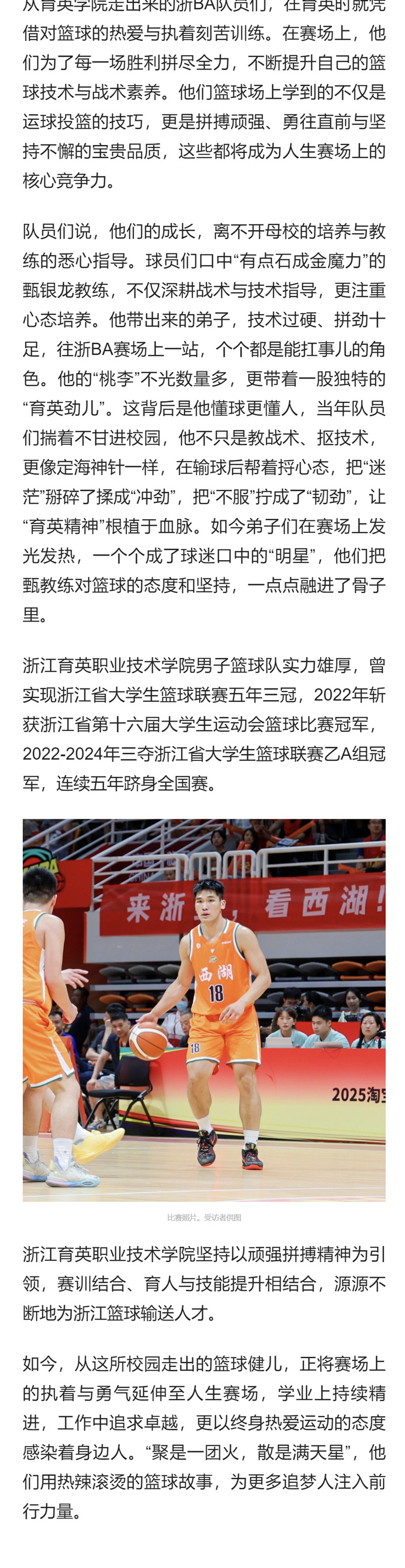 浙江育英职业技术学院坚持以顽强拼搏精神为引领,赛训结合、育人与技能提升相结合,源源不断地为浙江篮球输送人才。