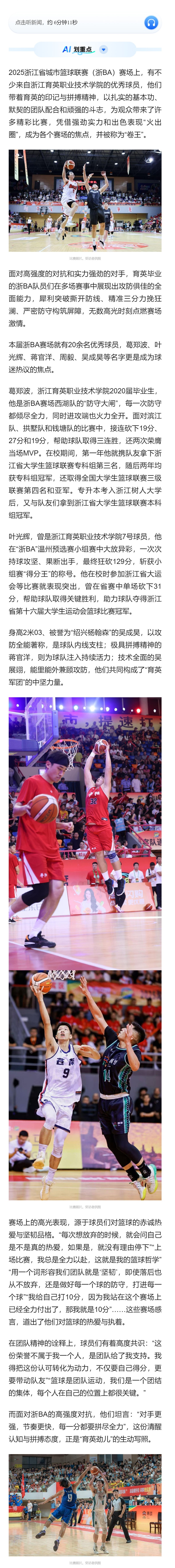 2025浙江省城市篮球联赛(浙BA)赛场上,有不少来自浙江育英职业技术学院的优秀球员,他们带着育英的印记与拼搏精神,以扎实的基本功、默契的团队配合和顽强的斗志,为观众带来了许多精彩比赛,凭借强劲实力和出色表现“火出圈”,成为各个赛场的焦点,并被称为“卷王”。