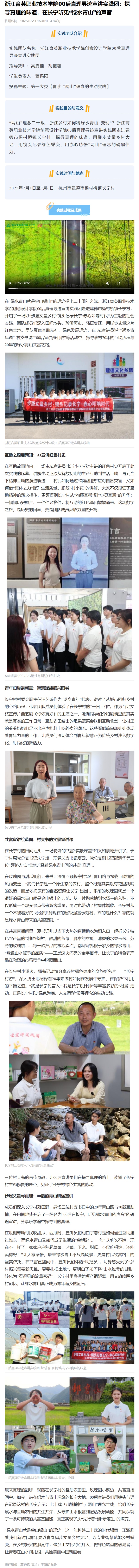 在“绿水青山就是金山银山”的理念提出二十周年之际,浙江育英职业技术学院创意设计学院00后真理寻迹宣讲实践团走进建德市杨村桥镇长宁村,开启了一场以“步履丈量乡村·镜头记录长宁·赤心叩响时代”为主题的社会实践。团队成员们深入田间地头,聆听历史,感悟变迁,用脚步丈量这片红色土地。团队聚焦互助精神、绿色发展理念,在“AI宣讲员说”“返乡青年说”“村支书说”“00后宣讲员们说”等活动中,探寻该村70年的互助历程与20年的绿水青山共富之路。