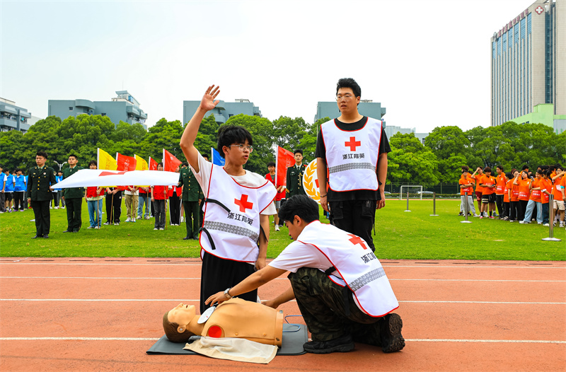 作为全国急救教育试点学校,浙江育英职业技术学院连续19年开展卫生健康知识与急救技能竞赛。作为杭州市红十字会钱塘区应急救护实训基地、应急救护考点、应急救护实操体验点,还提供红十字应急救护培训平台地图服务,面向钱塘区居民和学校提供应急救护实操体验和救护员培训、考核服务,推动急救教育走深走实。利用“志愿者服务”拓展急救教育受益面,成立师生共同参与的育英“急救侠”应急救护志愿服务队,更广泛范围参与普及急救知识和技能。在学生暑期三下乡活动中,组织志愿者队伍进入农村科普急救知识和技能,扩展急救教育辐射面和受益面,同时增强师生社会责任感,造福社会。