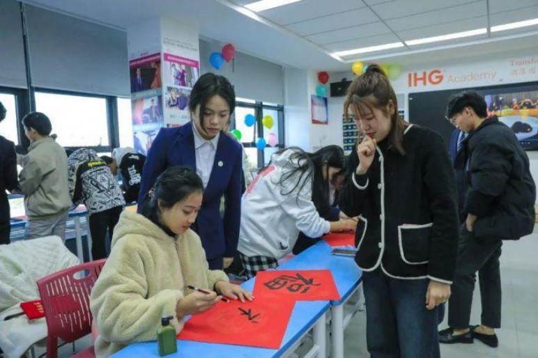 除了文化参访和民俗体验,学校还通过社团活动向老挝留学生传播中国传统文化。书法是中华民族的文化瑰宝,每当重要的节庆日都有写福、送福的风俗。在社团活动中,学校组织书法爱好者与老挝留学生一起书写“福”字。从握笔、沾墨到落笔,一笔一划勾勒中国汉字,老挝留学生在汉字书写中感悟中华文明的魅力。一张张大红字上出现了各式的“福”字,老挝留学生惊喜地拿着自己书写的“作品”拍起了照片。画脸谱、品茶香、写春联、贴福字等一系列生动有趣的活动,这些活动不仅让老挝留学生们体验到了中华文化的深厚底蕴,更增强了他们的参与感、体验感和获得感。