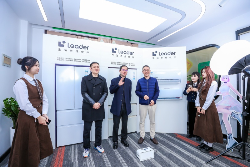 浙江育英职业技术学院校长丁金昌,海尔智家Leader品牌总经理张丹、Leader品牌运营商浙江百诚集团常务副总裁喻焕在校园直播基地直播现场,为直播间粉丝送出祝福并发放福利。