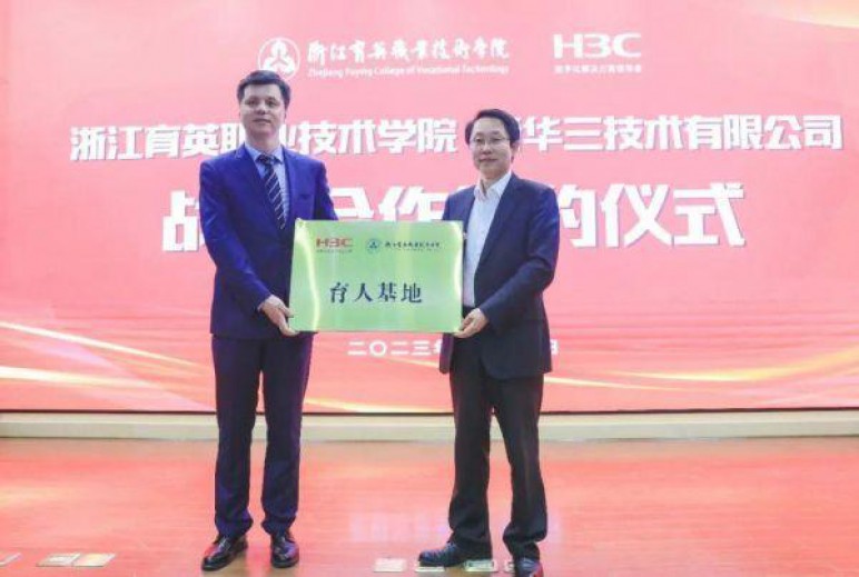丁金昌致辞。他介绍了学校基本情况,并表示,本次战略合作签约,是学校与企业“无缝对接”,专业与产业“同频共振”,深化产教融合的实质性举措。他说,育英学院和新华三都是习近平总书记曾经视察过的单位,习近平总书记的殷切嘱托一直激励着育英人不断向前奋进。经过多年发展,学校特色和优势更加明显,所有专业紧密对接浙江省、杭州市支柱产业。自建校以来,学校坚持立德树人,主动适应市场需求,着力于培养高素质复合型技术技能人才,精心设计人才培养方案,不断深化产教融合,全面推动与头部企业全方位合作,分别成立了“育英-深信服产业学院”“育英-海尔智家智慧零售产业学院”等产教融合载体。本次与新华三合作的信息技术专业群,在专业建设、教学改革中成果丰富,尤其是赛教融合的教学特色明显,学生在各类竞赛中获得特等奖、一等奖百余项,在浙江省乃至全国具有较大影响力。新华三集团作为数字化解决方案领导者,深度布局“芯-云-网-边-端”全产业链,不断提升数字化和智能化赋能水平。校企双方可以在人才培养、实践基地建设、团队共建、课程共享、职业证书开发、党建共建等方面进行深度合作、资源共享、优势互补,达到学校、企业、学生三位一体的有机结合,最终实现三方共赢。