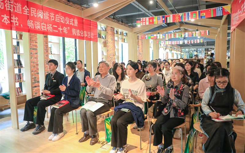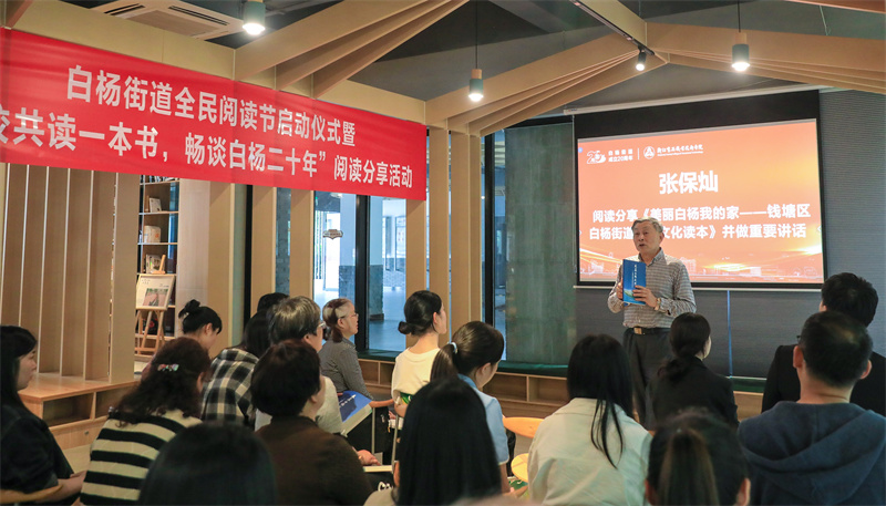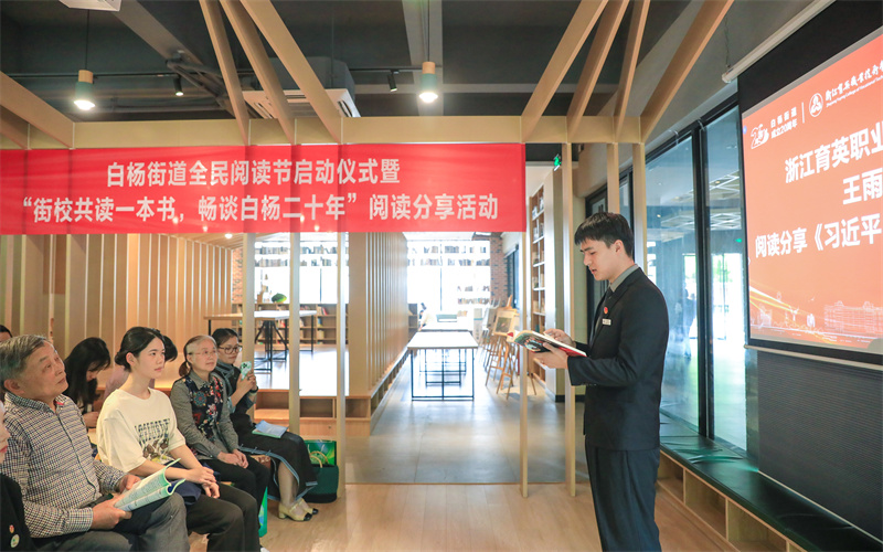 在书吧进行的“街校共读一本书,畅谈白杨二十年”阅读分享活动会上,双方以《习近平与大学生朋友们》和《美丽白杨我的家——钱塘区白杨街道历史文化读本》等书籍为蓝本,回顾学校与街道共同蓬勃发展的二十年,结合自身实际,交流参观学习的感受。