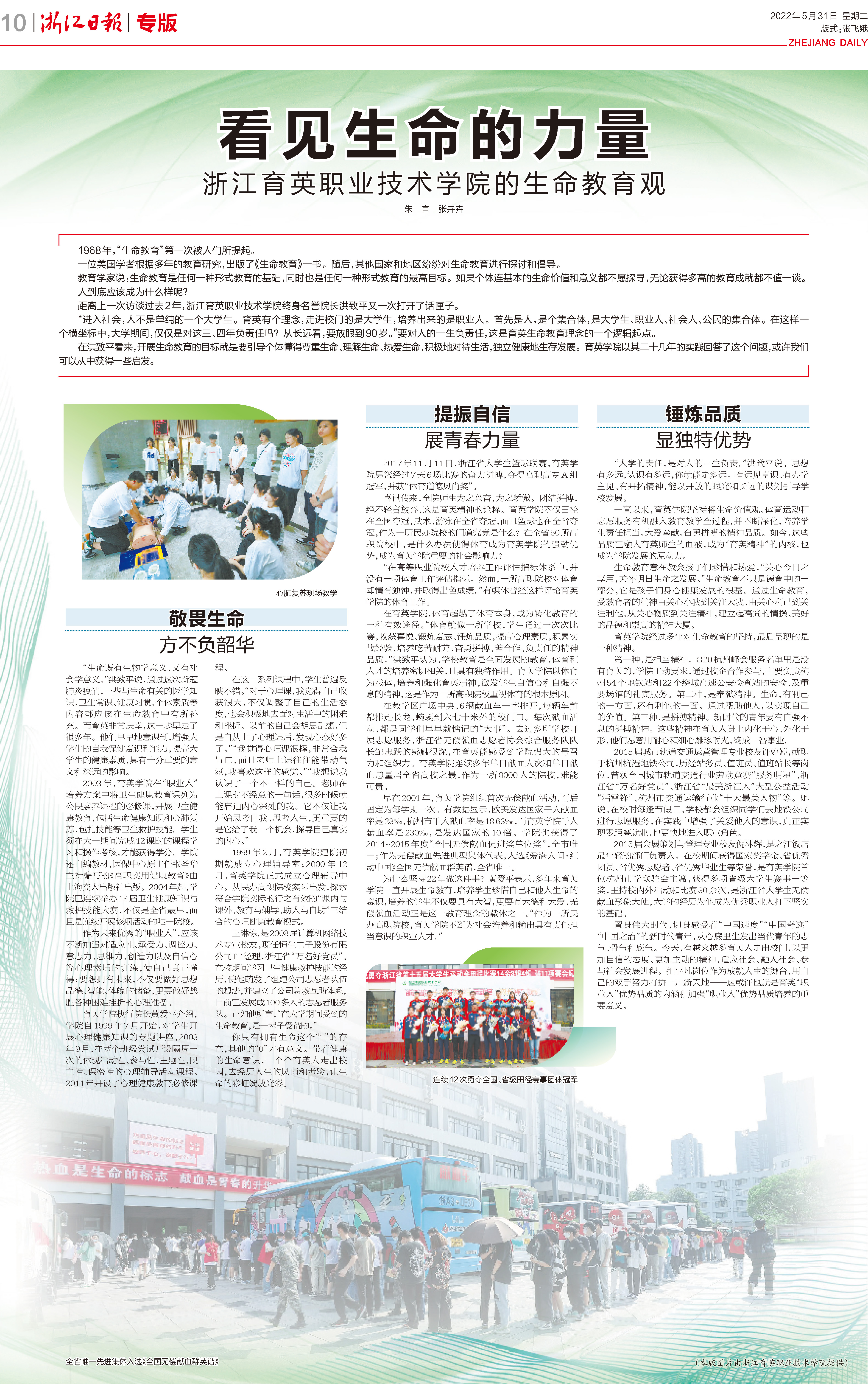 2003年,育英学院在“职业人”培养方案中将卫生健康教育课列为公民素养课程的必修课,开展卫生健康教育,包括生命健康知识和心肺复苏、包扎技能等卫生救护技能。学生须在大一期间完成12课时的课程学习和操作考核,才能获得学分。学院还自编教材,医保中心原主任张圣华主持编写的《高职实用健康教育》由上海交大出版社出版。2004年起,学院已连续举办18届卫生健康知识与救护技能大赛,不仅是全省最早,而且是连续开展该项活动的唯一院校。