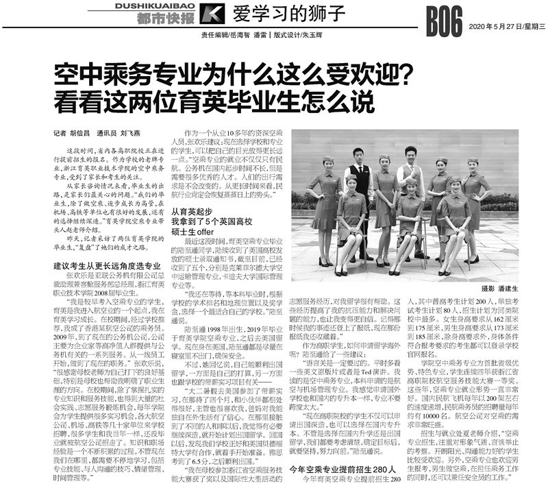 “我在母校参加浙江省空乘服务技能大赛获了奖以及国际性大型活动的志愿服务经历,对我留学很有帮助。这些经历提高了我的抗压能力和解决问题的能力,也让我变得更自信。记得那时候我的事迹还登上了报纸,现在那份报纸我还收藏着。”
