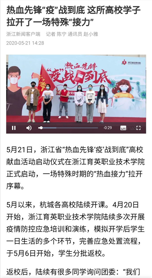 “无偿献血活动已经成为校园一道亮丽的风景。它像一扇形象的窗口,展示了育英育人的成效,通过无偿献血活动,我们看到了我院学生大爱大德的情怀和积极奉献的精神风貌。”浙江育英职业技术学院党委副书记、副院长谢鑫告诉记者。据统计,2001年-2019年,浙江育英职业技术学院共有15508名师生参与无偿献血活动,累计献血总量达4566780毫升。20年来,学院每年举行两次无偿献血活动,千人献血率达230‰。