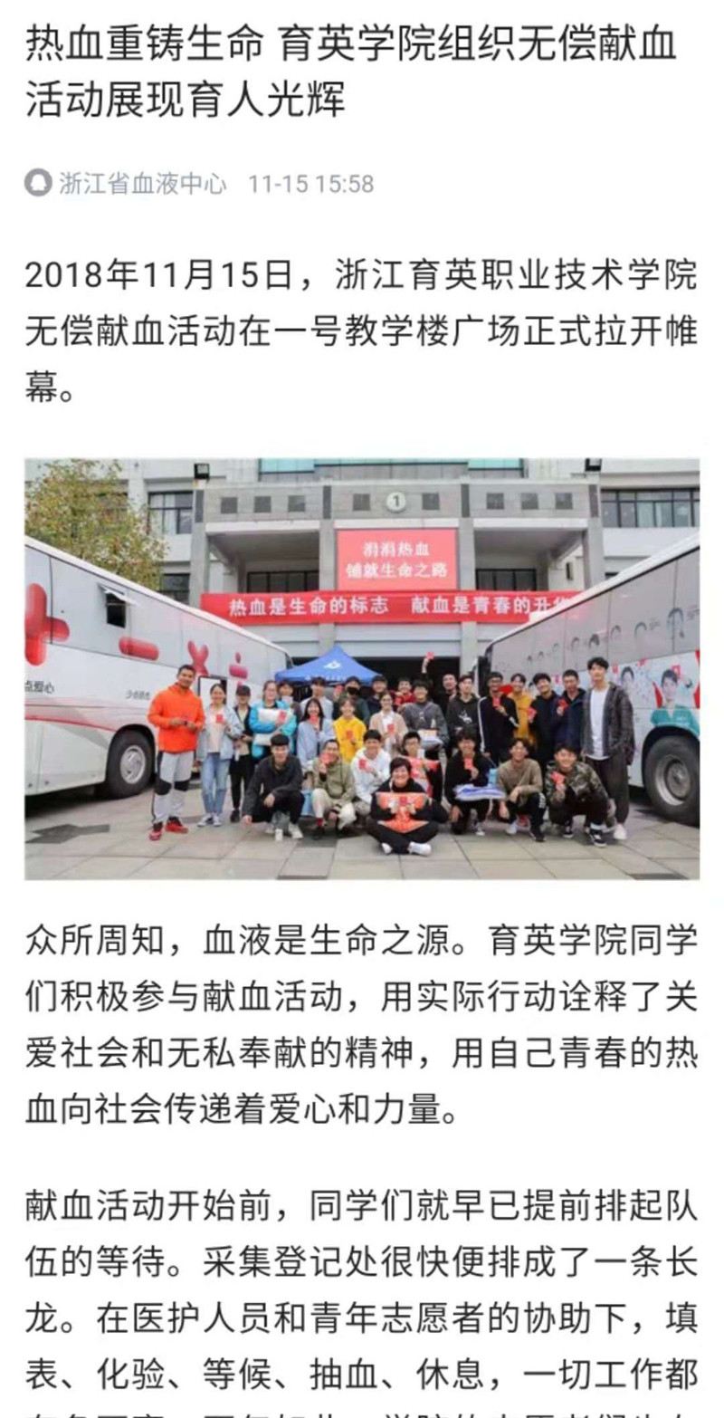 浙江育英职业技术学院院长盛健介绍,学院每年举行两次无偿献血活动,2001年至2017年,共计有11893名师生,累计献血3432530毫升。