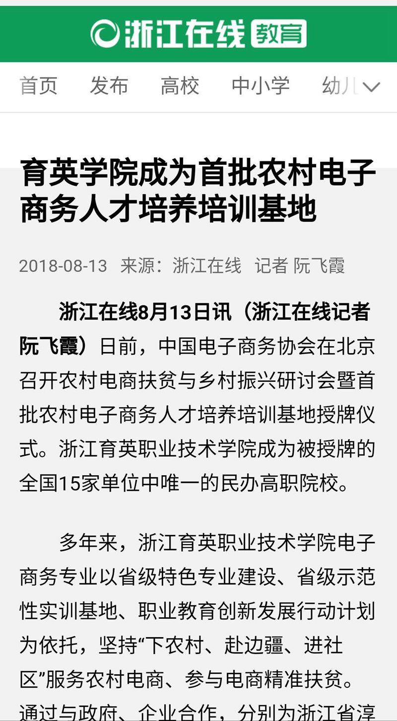 中新网浙江新闻7月24日电(王题题)近日,在北京召开的农村电商扶贫与乡村振兴研讨会暨首批农村电子商务人才培养培训基地授牌仪式上,浙江育英职业技术学院(下称“育英学院”)成为被中国电子商务协会授牌的全国15家单位中唯一的民办高职院校。