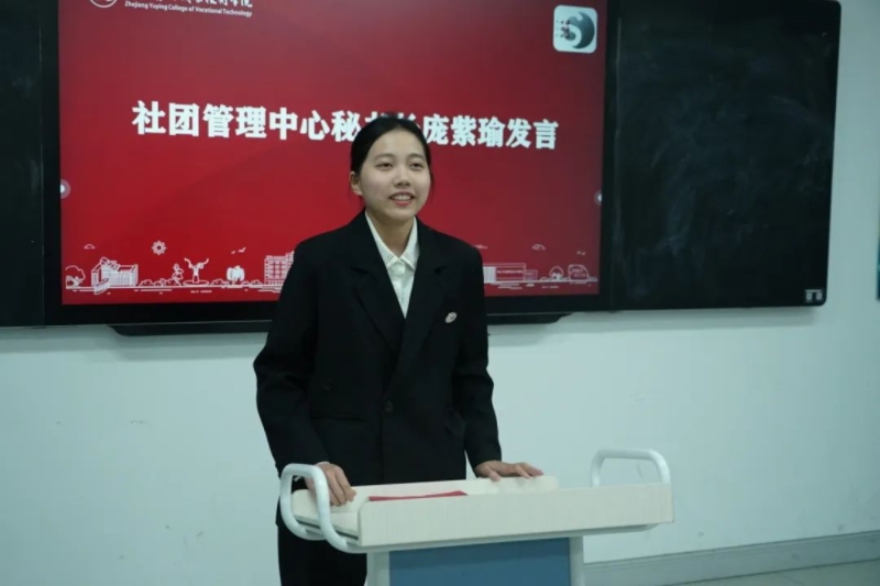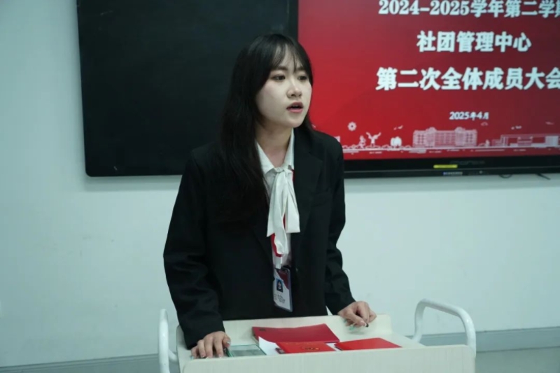 社团管理中心秘书长庞紫瑜发表了系统务实的讲话。她先回顾了本学期以来各部门的工作成果,然后介绍了接下来会开展的一些活动和比赛,并对下一阶段的各项活动规划提出了具体要求。