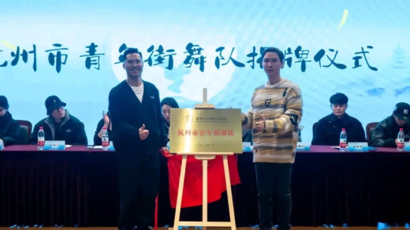 浙江省街舞运动协会副会长兼团工委书记、杭州市街舞运动协会秘书长王红波,浙江省街舞运动协会监事长、杭州市街舞运动协会副会长刘鹏程为杭州市青年街舞队揭牌。