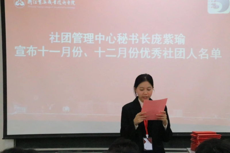 庞紫瑜秘书长宣读十一、十二月份优秀社团人名单