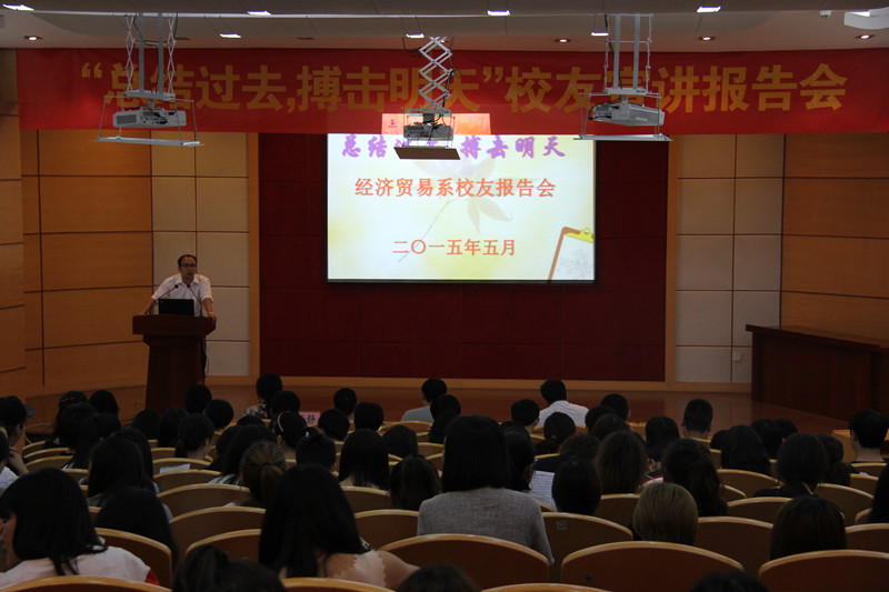 2015年5月29日晚上19:00时,经济贸易系在三楼报告厅召开了“总结过去,搏击明天”校友报告会。经贸系主任谢厚华老师、党总支书记田翔老师、实践教研室全体老师以及2015届毕业生参加了此次报告会,报告会由学工秘书余国浩主持。