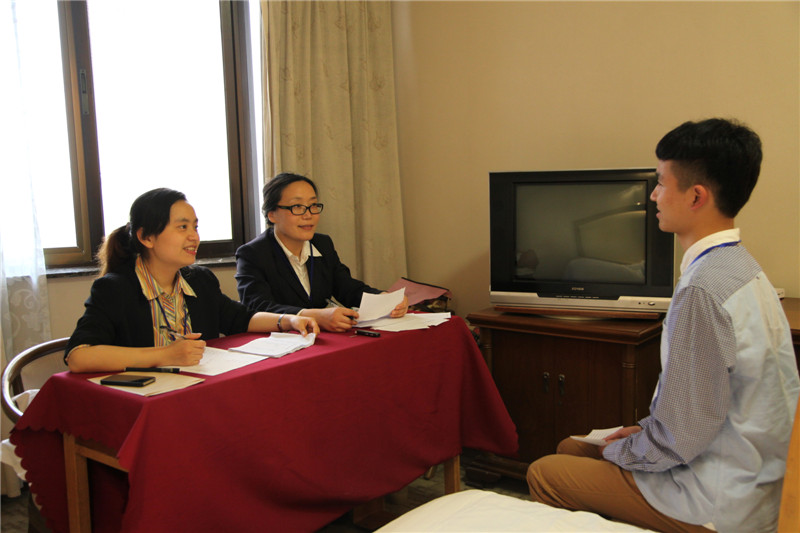综合面试环节的考官由航空公司专家以及学院空中乘务专业教师组成,具有丰富的航空服务经验。考官们参照航空公司选拔人才的标准,主要通过考生自我介绍考察口头表达能力,通过他们的站姿、走姿和肢体语言来考察身材、气质,通过提问考察考生沟通能力、应变能力和亲和力等综合素质。