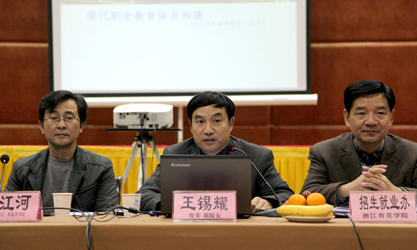 我院分管教学副院长王锡耀作主题报告,他从现代职业教育体系的认识、台湾职业教育对构建现代职业教育体系的启示、中高职衔接的问题与对策的思考、浙江省中高职衔接的政策措施四点进行了论述。