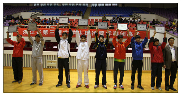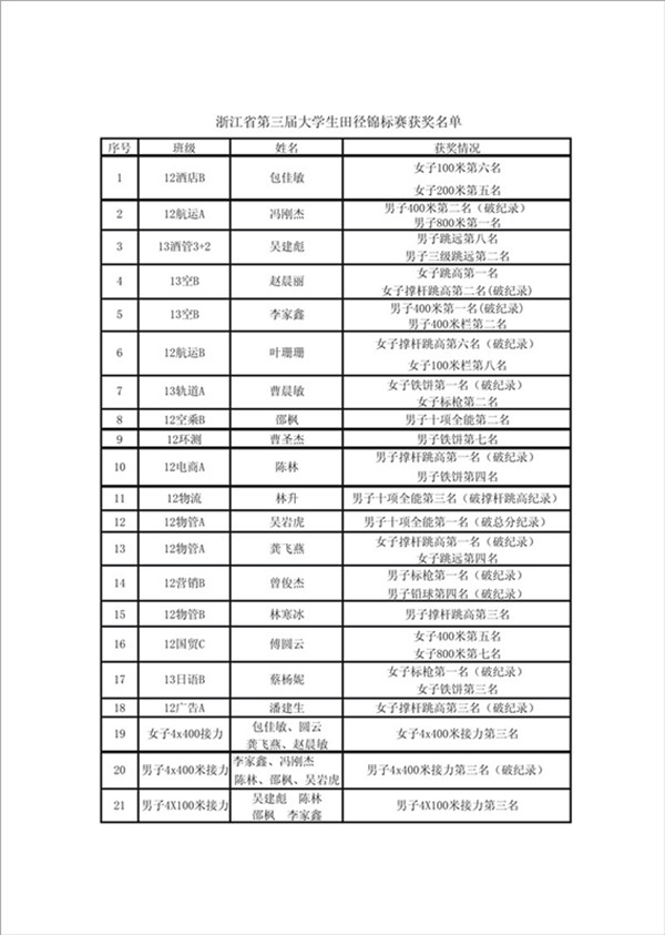 11月8日-11日,浙江省第三届大学生田径锦标赛在浙江理工大学举行。我院田径队派出18名运动员参赛,战果辉煌。运动健儿摘9金夺6银7铜13人次破9项纪录,获团体总分第一名,男子团体总分第一名,女子团体总分第二名,女子撑杆跳高包揽前三名3人破纪录,男子十项全能包揽前三名1人破纪录。
