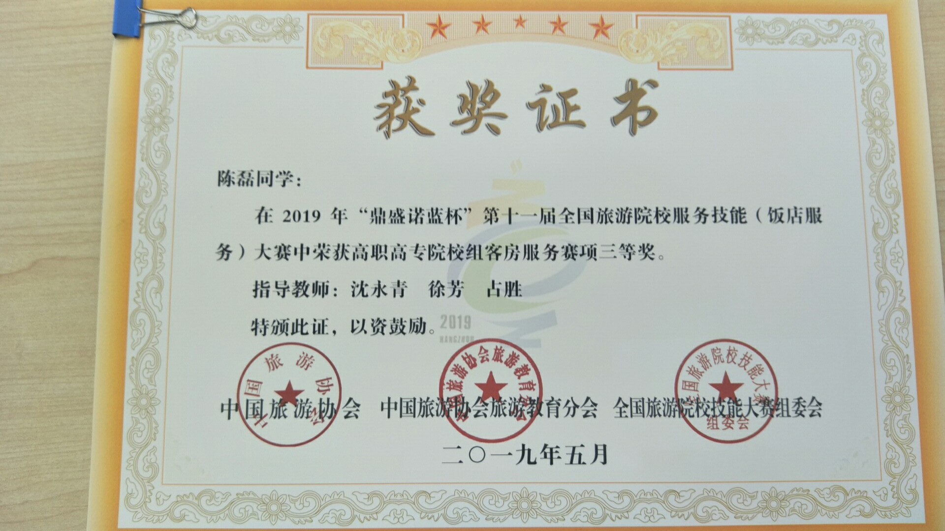在刚刚结束的“ 鼎盛诺蓝杯”第 十一能 届全国旅游院校服务技能 ( 饭店服务 )比赛中,我院18级洲际英才班的陈磊同学获得了高职组中式铺床项目的三等奖。此次比赛由中国旅游协会主办,浙江旅游职业学院承办,共有来自全国 298 所院校参赛队的 954 名选手参赛。比赛分本科组、高职组、中职组三个组分别进行,其中高职组共有中餐宴会摆台、西餐宴会摆台、中式铺床及开夜床、规定鸡尾酒调制及自创鸡尾酒调制四项比赛。因为时间比较紧,酒店专业仅选择了中式铺床比赛项目。通过此次比赛,专业老师观摩了其他所有项目的比赛,与其他院校的老师和学生进行了交流,学习了很多别的院校竞赛指导的经验,对下一次参赛积累了经验。