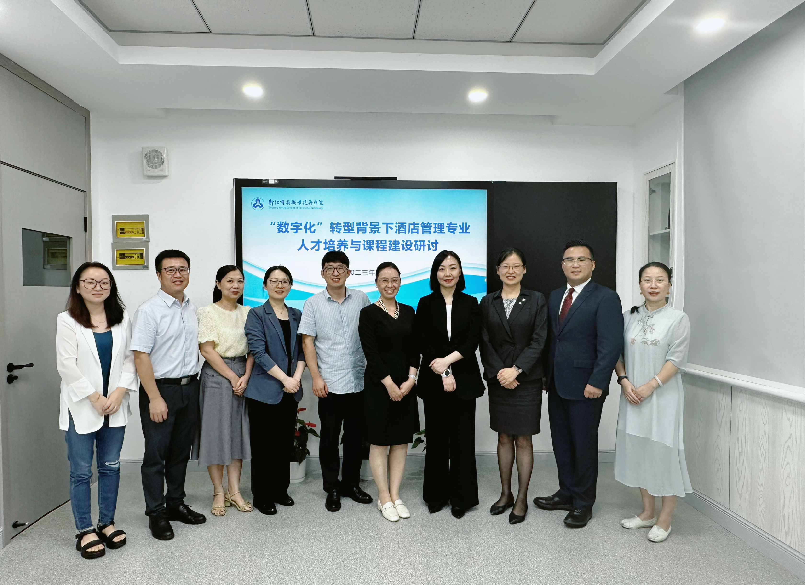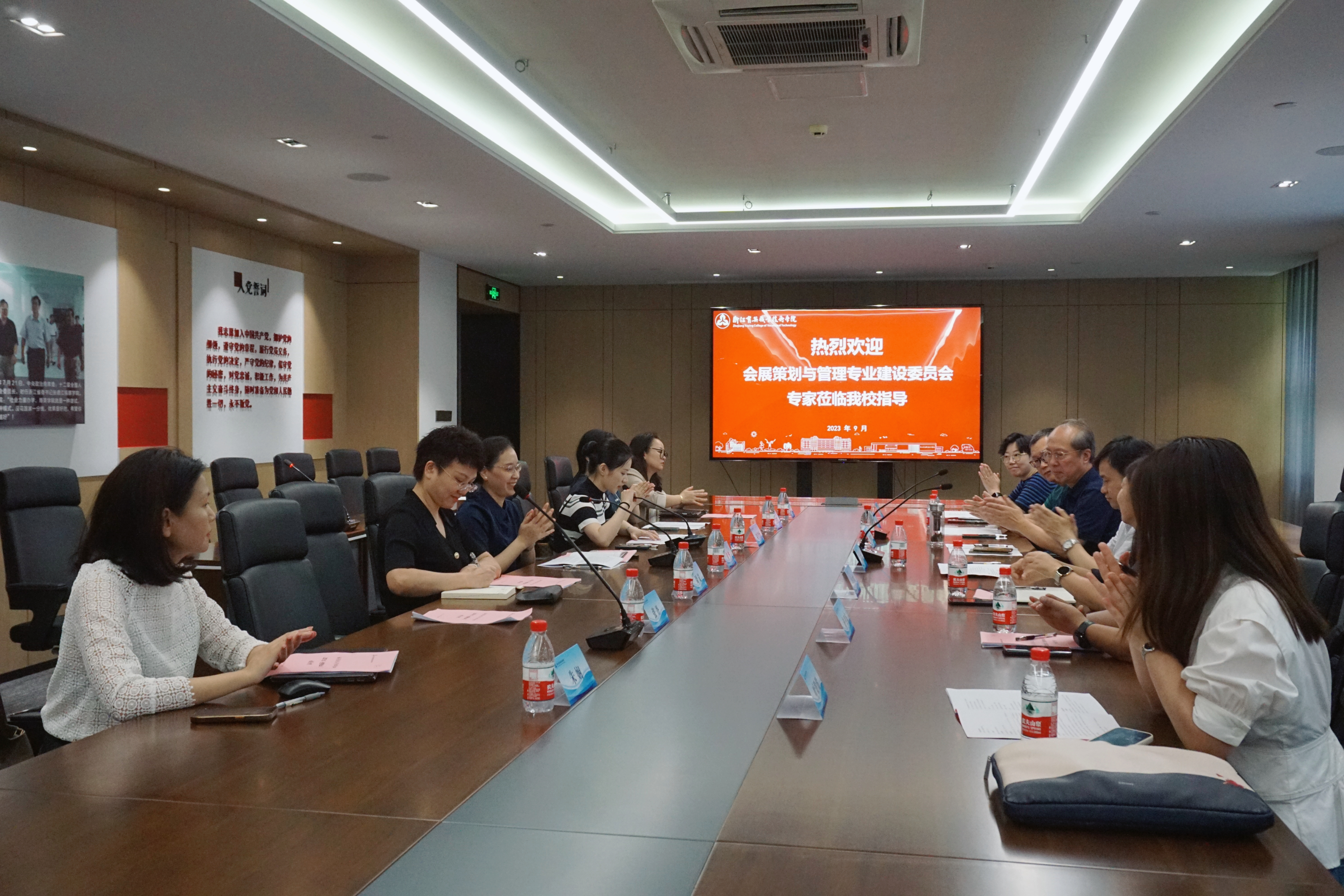 参加人员:杭州市商务局市发展会展业服务中心副主任(负责人)杨骏,教育部旅游管理教指委委员、浙江省会展业标准化技术委员会主任委员任国岩教授,浙江省会展业标准化技术委员会秘书长、浙江省会展行业协会副会长方曦,浙江时代国际展览服务有限公司董事长许旦萍,杭州会展集团·杭州国际交流服务中心总经理沈静,杭州中国国际动漫节会展有限公司经理许卫东,浙江米奥兰特商务会展股份有限公司营销总监叶盼盼,学院领导及会展专业全体老师。