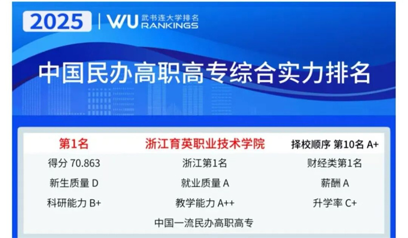 武书连2025中国高职高专评价排行榜发布,学校在全国322所民办高职高专院校中综合实力位列第1名,财经类位列第1名,教学能力A++,入选中国一流高职高专。