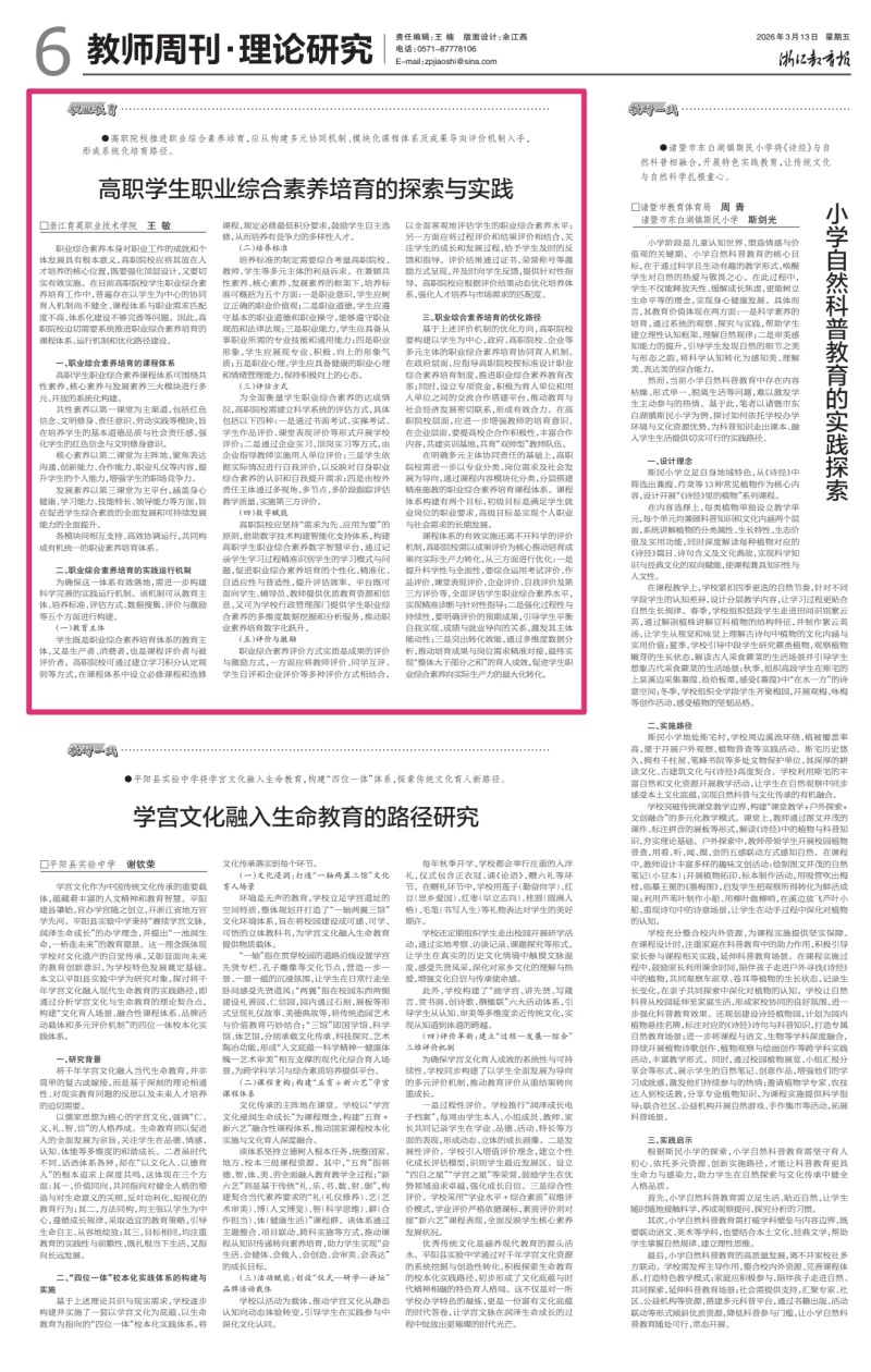 3月13日,《浙江教育报》理论研究版刊发我校党委副书记、副校长王敏教授署名文章《高职学生职业综合素养培育的探索与实践》。