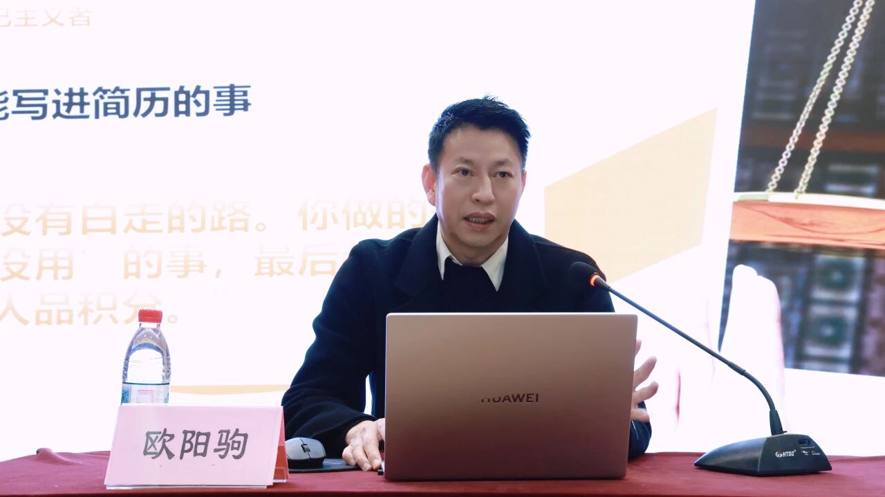 欧阳院长以芯片作喻,将学生干部比作学院的“核心引擎”,从“强芯、赋芯、聚芯、创芯”四个维度展开分享。“强芯”环节通过“精致的利己主义者”等案例,强调学生干部的三重身份——学生是底色,干部是亮色,商贸人是特色,商贸学院的干部需具备商业思维与数智意识,寄语“别把自己当领导,你就是个群管理员”。“赋芯”部分提出数智化工作、项目制策划、高情商沟通能力、舆情应对能力等四大能力,以学生用Excel高效完成档案录入、抖音涨粉2万等实例,激励“用创业的心态做工作”。“聚芯”环节讲述学生临危受命稳控论坛、“退休”部长整理手册等故事,诠释“职位是暂时的,但人品是长久”的格局之道。“创芯”部分鼓励拥抱AI工具、培养跨界思维。整场讲座金句频出,案例生动,现场掌声不断。