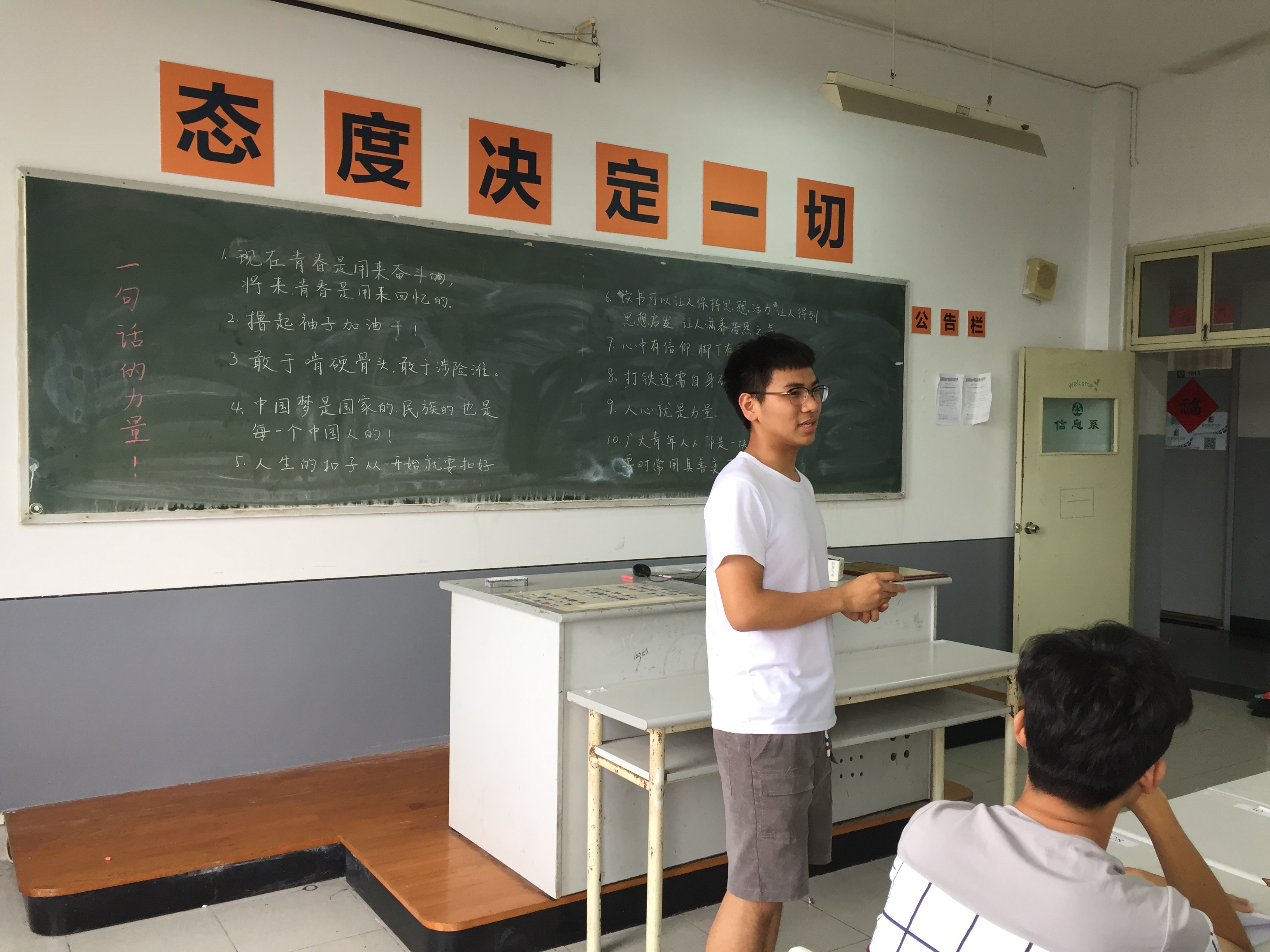 党的十八大以来,习近平总书记先后发表了一系列重要讲话,立意高远、思想深邃,内涵丰富、生动形象,有着独特的个人语言风格和魅力。这次学习李老师选取了习近平总书记的十句讲话写在黑板上,让同学们分别选一句最有感触的话进行阐述和分享。李老师先抛砖引玉,针对习总书记那句“人生的扣子从一开始就要扣好”分享体会。好的开始是成功的一半,从最开始就要有一个良好的态度,才能把事情做好。接下来。每个同学都选了一句最喜欢的讲话发表看法。