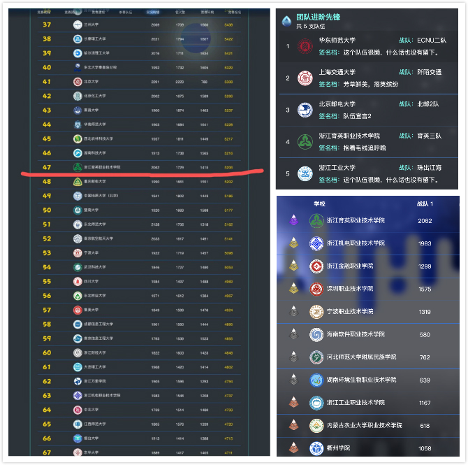 本次天梯赛吸引了300多所本专科高校950支队伍9000余名选手参加,其中珠峰争鼎组(985、211组)第一名为浙江大学,华山论剑组(本科组)第一名为浙江工业大学,沧海竞舟组(高职高专组)第一名为浙江育英职业技术学院,第二、第三、第四名分别为浙江机电职业技术学院、浙江金融职业学院、深圳职业技术学院。其中,浙江育英职业技术学院以5206分的总分力压第二名浙江机电职业技术学院近500分,以绝对优势取得全国高校特等奖!