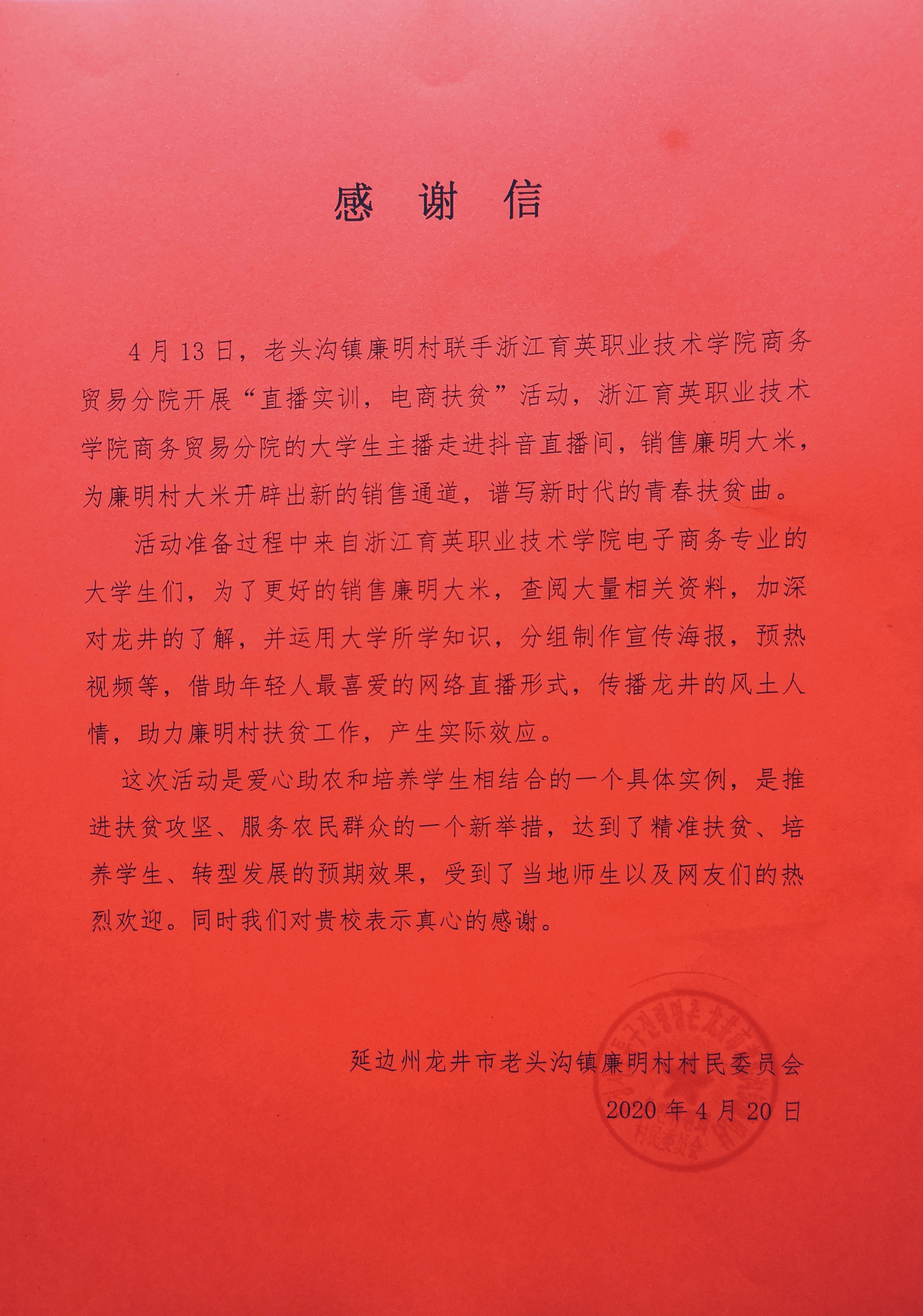 “直播实训,电商扶贫”活动得到了龙井市有关部门的关注,当地的“龙井扶贫”公众号对此次直播活动进行了报道。廉明村村委领导还专门给我院发来的感谢信,表达了对此次合作的肯定以及对校园主播们的鼓励。