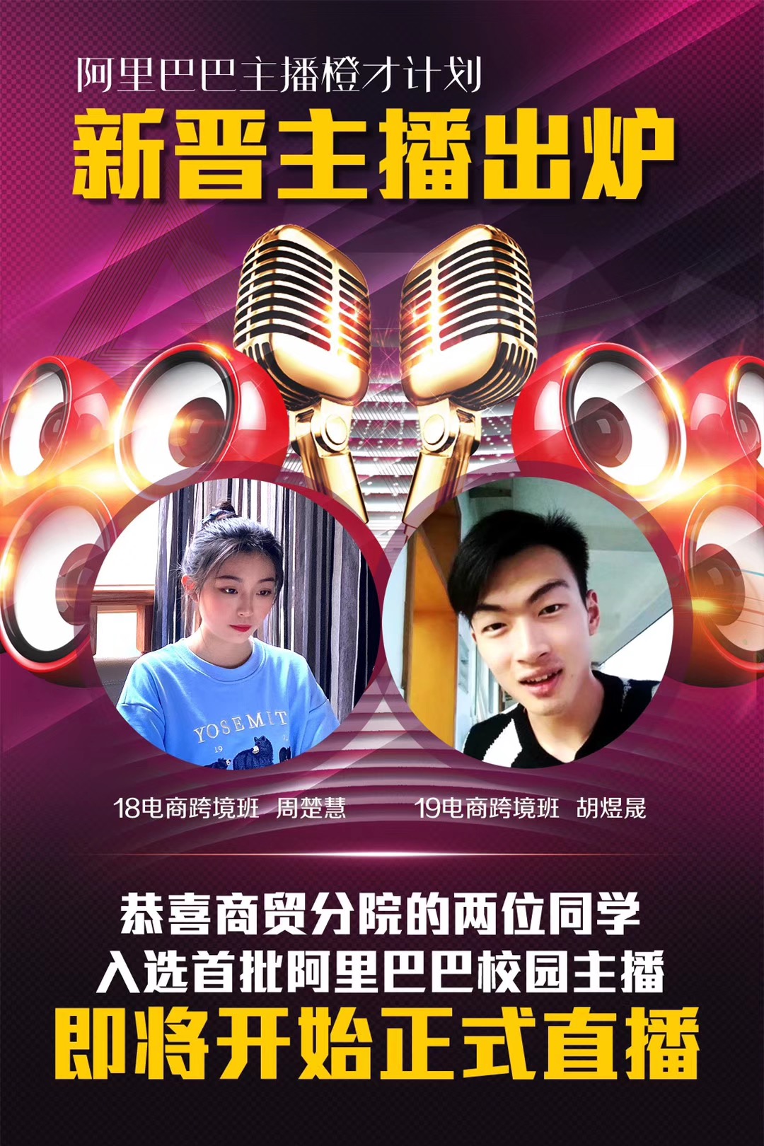 2020年3月17日,阿里官方公布了“电商直播主播培育与实践项目”的遴选结果:报名参加招募活动的126名学生,经初试与面试,最终有4名学生成功入选电商直播主播培育项目,可以正式为阿里官方做试播。在这4位主播培育人选中,有2位来自商贸分院,分别是18跨境电商班周楚慧同学和19跨境电商班胡煜晟同学。