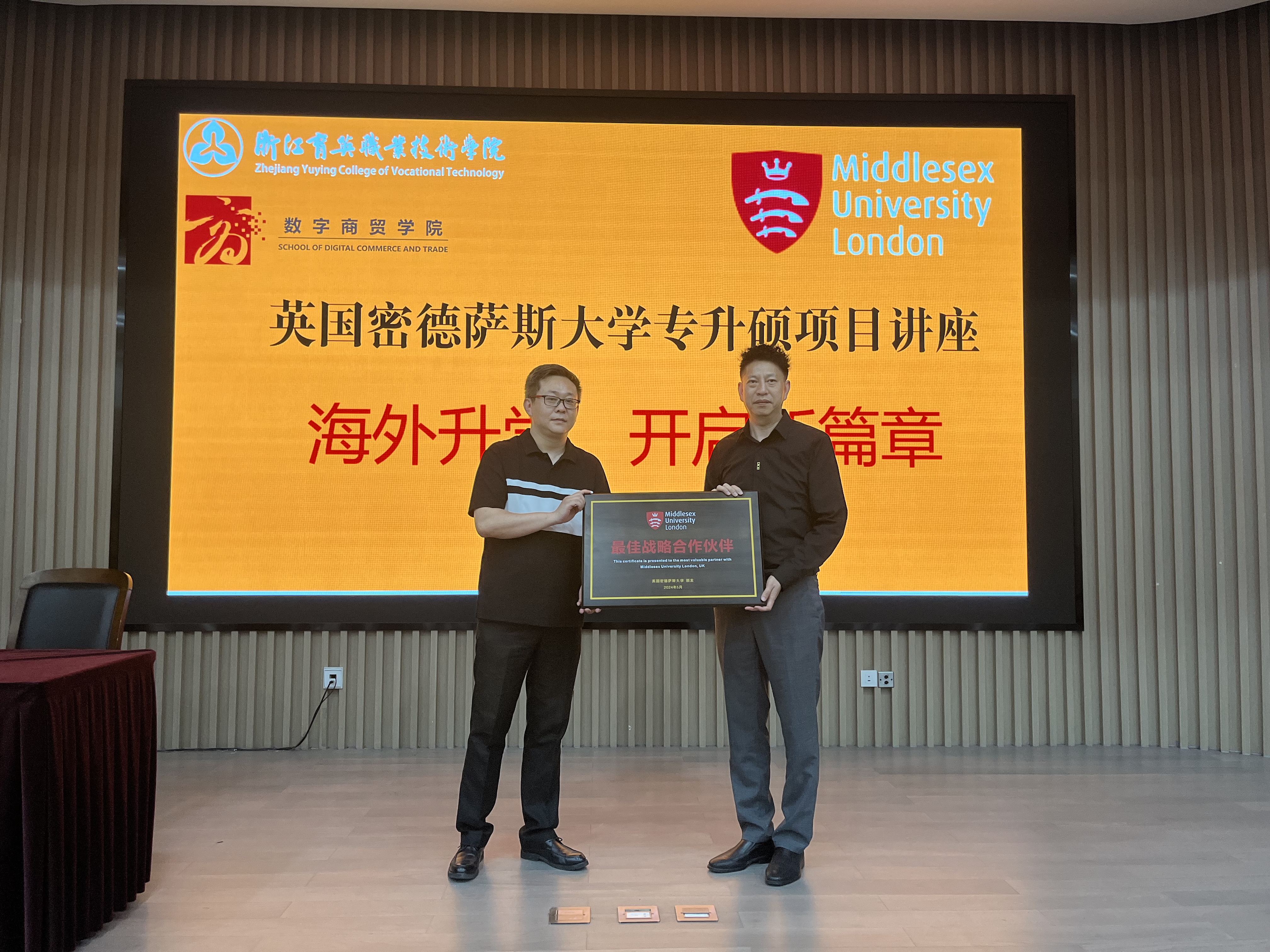 一、由密德萨斯大学校方代表授予数字商贸学院“最佳战略合作伙伴”牌匾,为双方的友好合作奠定坚实的基础。