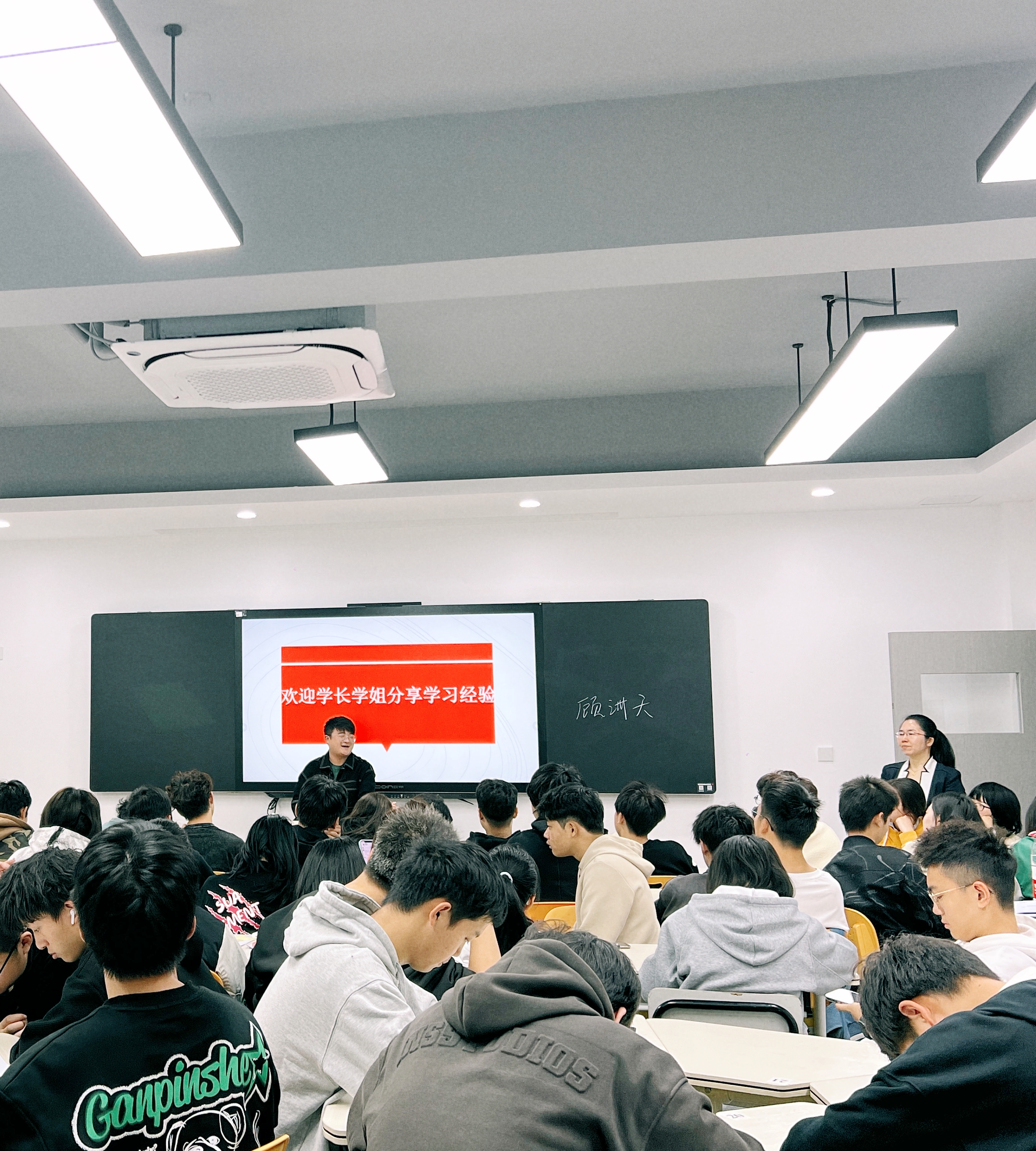 会议第二部分由顾洲天和张子豪等几位比赛得奖者和奖学金一二等奖获得者分享学习经验,这几位同学从各自不同的立场出发细致耐心地分享了一年或者两年的大学生经历,鼓励22级新生参加各种比赛和活动,充分展现自我,无愧于自己的大学生活。
