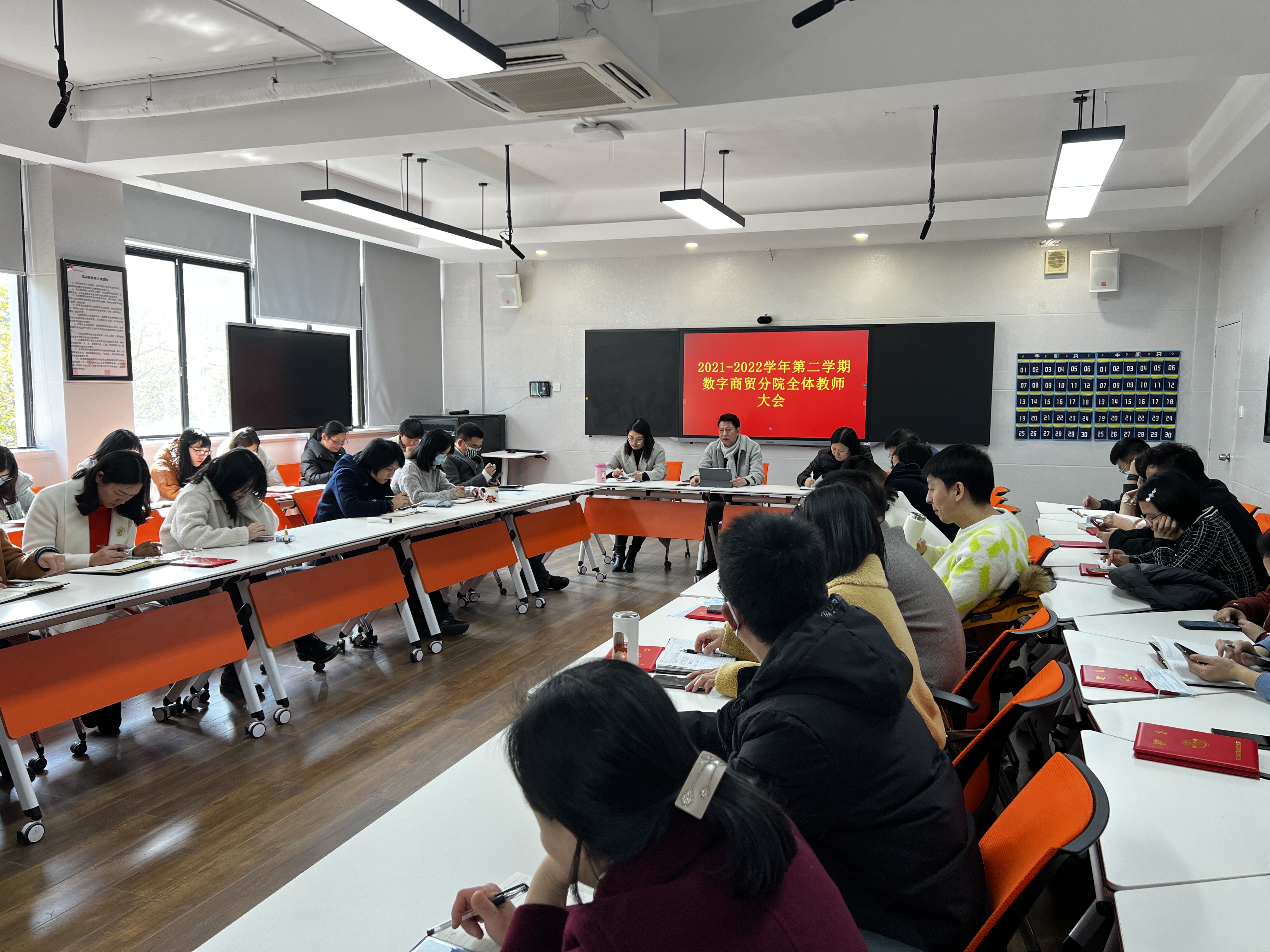 2022年2月26日下午13:30,数字商贸分院在3213智慧教室召开了新学期第一次全体教师大会。会议由王成伟老师主持,全体教师参加。
