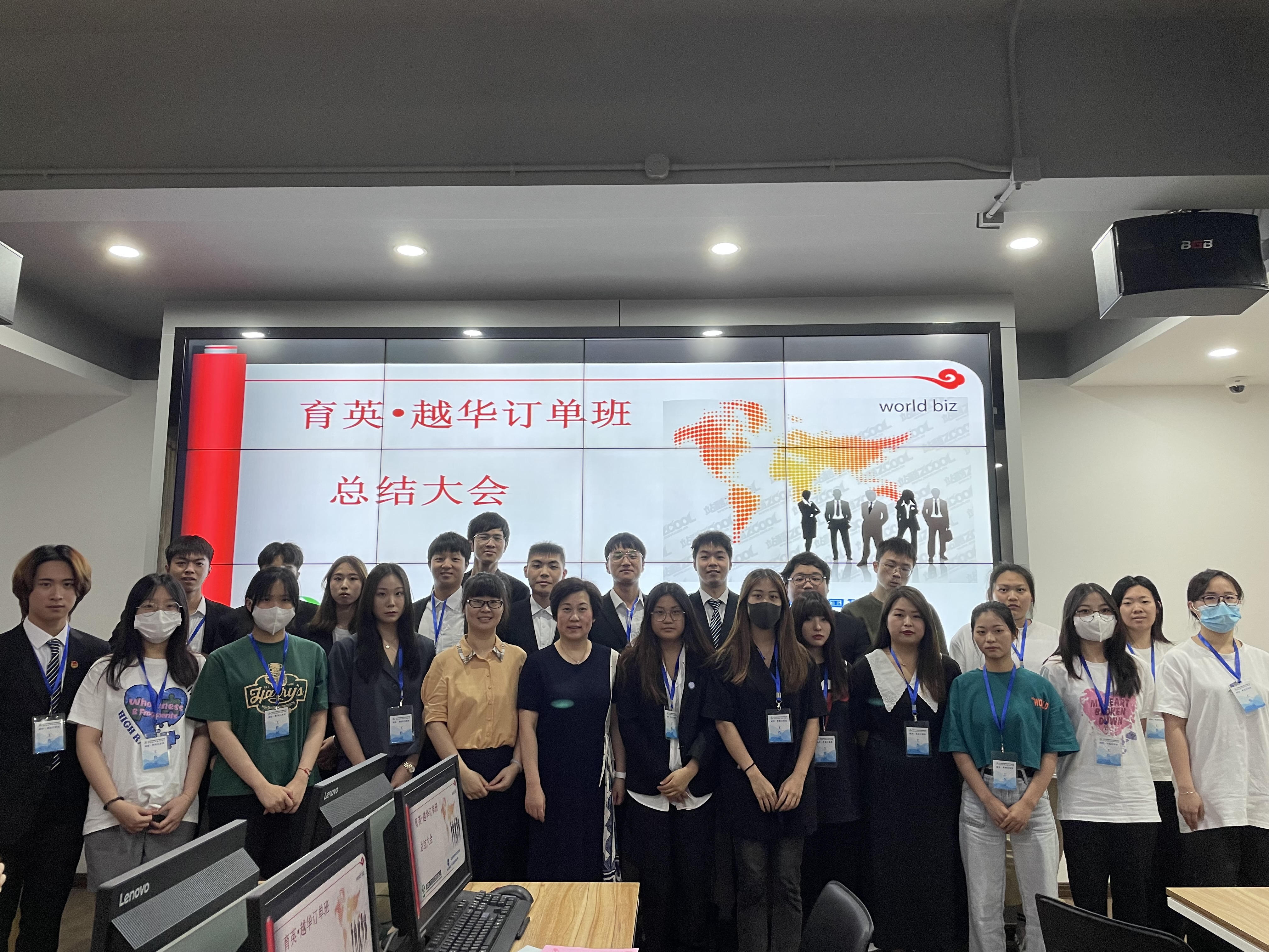 2021年6月22日下午在跨贸实训室2205举行了第七期越华·育英订单班结业仪式和现场招聘。参加结业仪式和现场招聘的有越华杭州公司黄总经理和市场部王经理、育英国贸傅祝屏、杨芬和魏巧米老师以及订单班的50位学生。