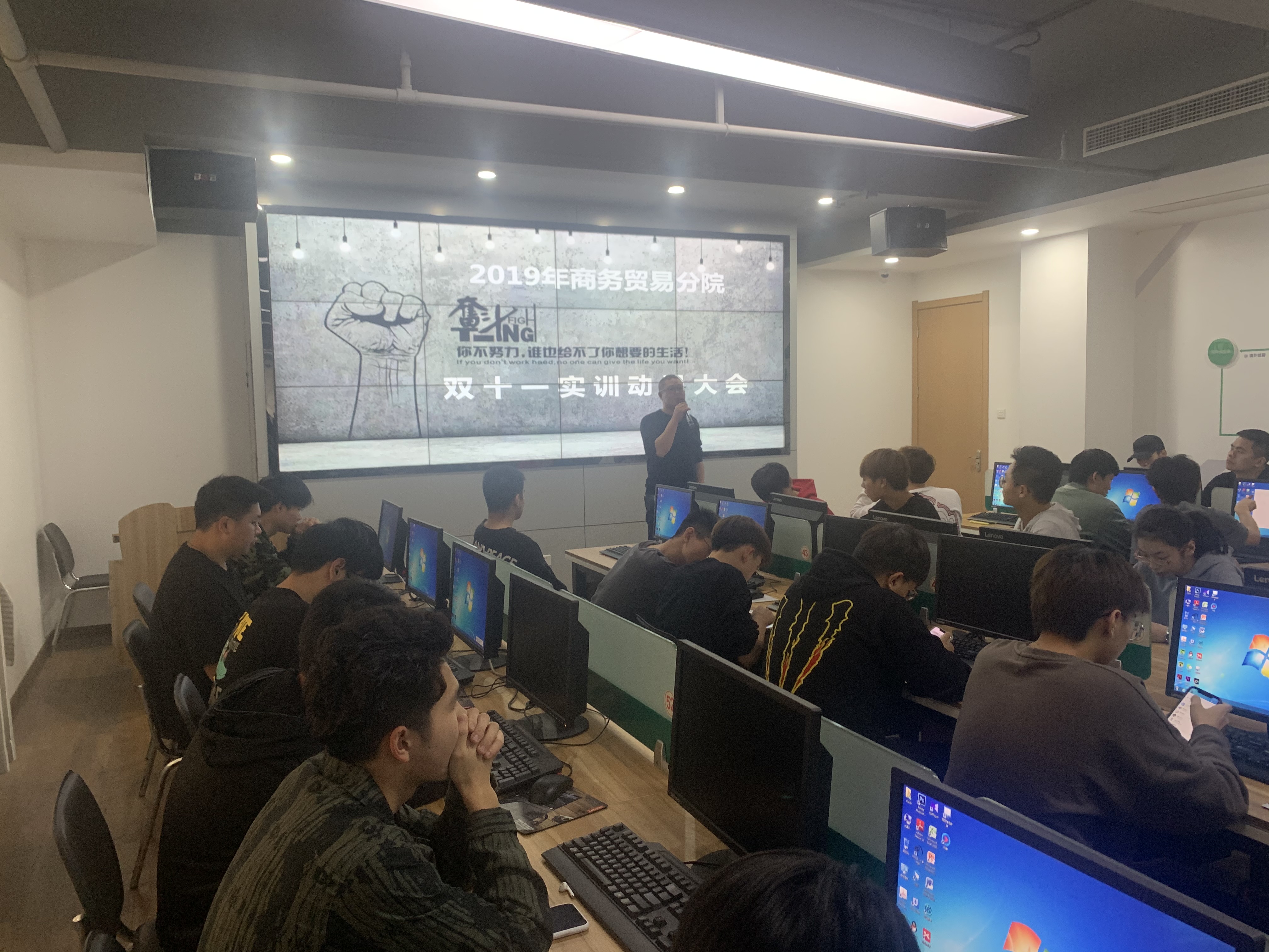 大会开始,吴有权老师从职业能力培养和课程设置的角度向同学们讲解了“双十一”实训的初衷与意义,鼓励同学们积极参与到实训中。