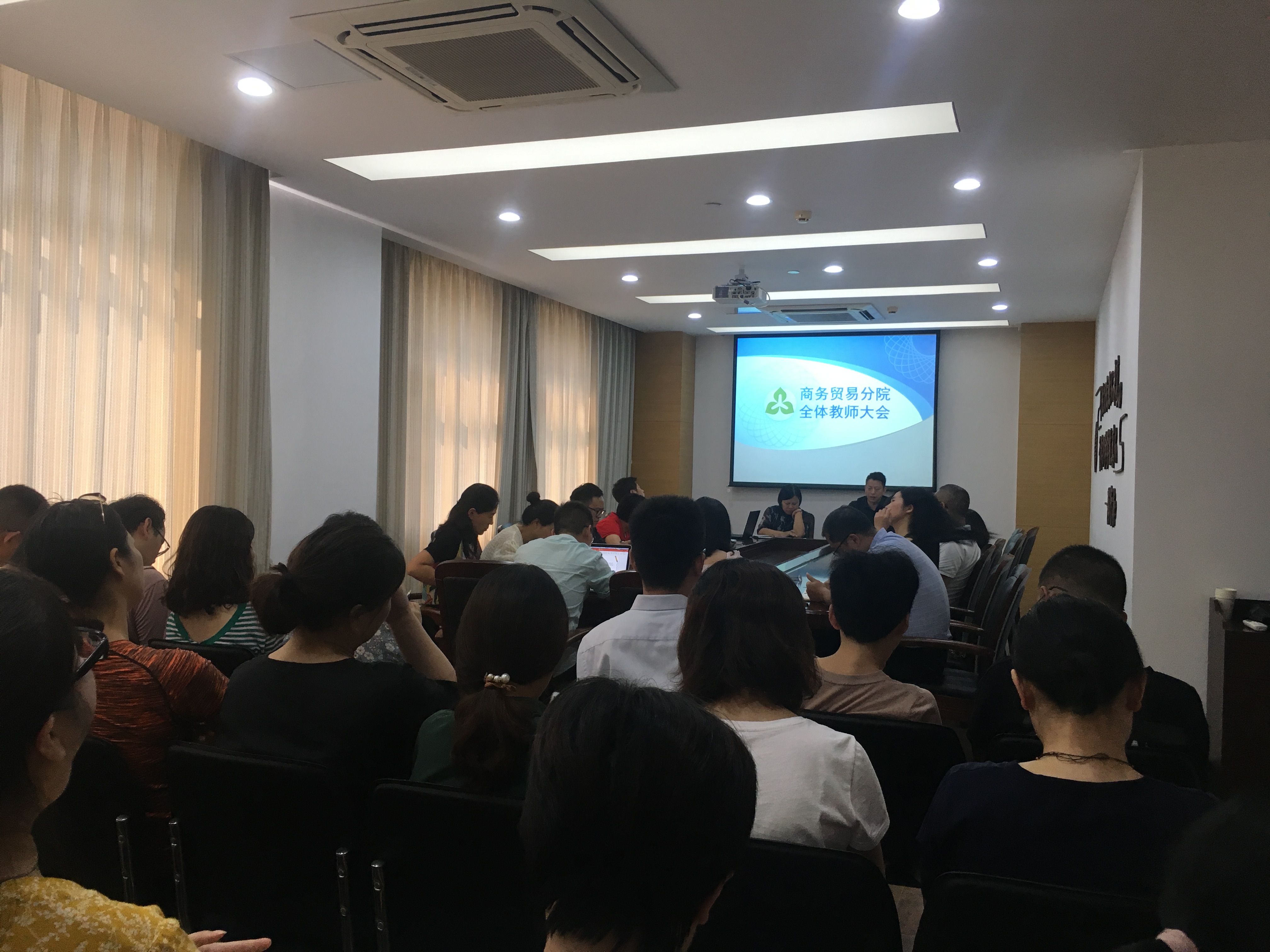 2019年9月7日下午,商务贸易分院全体教师在跨贸基地召开了新学期全体教师会议。分院院长欧阳驹、分院书记、副院长姜蕾、分院副院长陈贤平、分院副院长王慧及分院全体教师参加了本次会议。