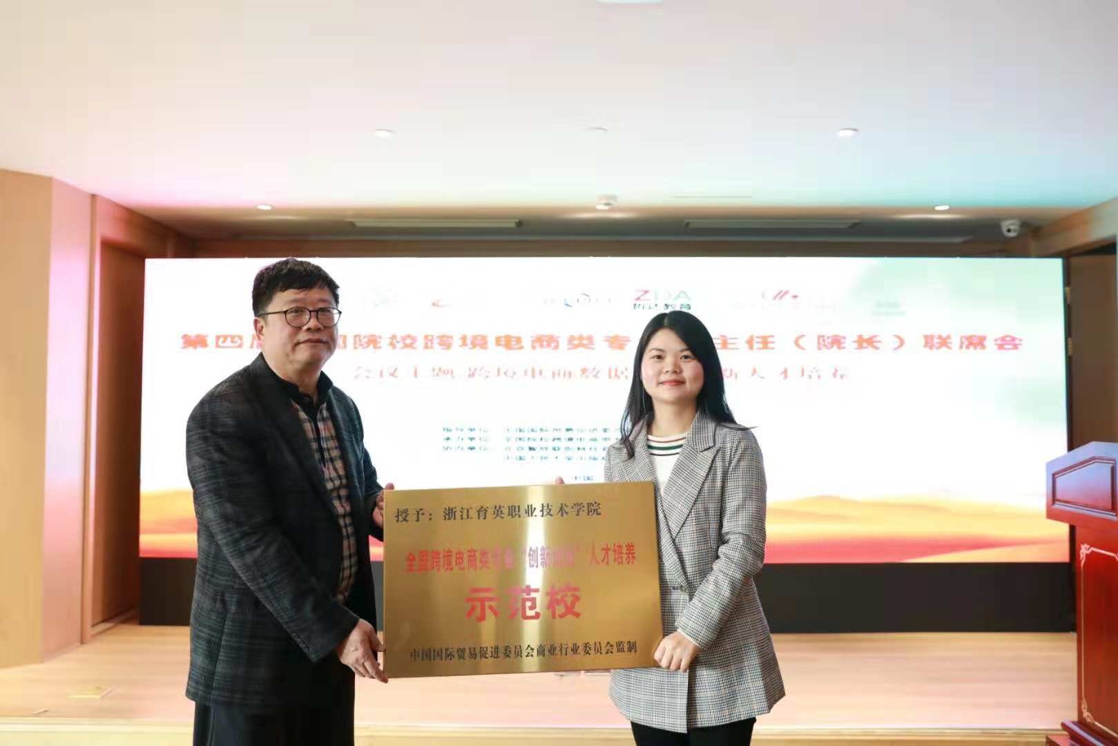 本次会议上,我院被授予全国跨境电商类专业“创新创业”人才培养示范校。由中国国际贸易促进委员会商业行会委员会颁发铜牌,这是我院继授予跨境电商专员分考点之后的又一新荣誉,既肯定了我院跨境人才培养探索与实践方面取得的成绩,又赋予了我们更多的使命,在探索后G20时代、人工智能以及数字贸易的背景下职教跨境电商人才培养模式与实践做出更大的努力,更好的发挥这方面的示范引领作用。