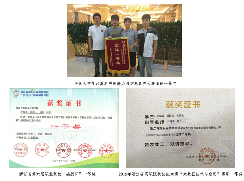 以赛促教、赛教结合是本专业的特色之一。信管专业学生先后获全国大学生计算机应用能力与信息素养大赛中团体一等奖,浙江省挑战杯创新创业竞赛一等奖,浙江省大数据技术与应用竞赛二等奖,全国大学生“互联网+”创新大赛暨第五届“发现杯”全国大学生互联网软件设计大奖赛APP赛项区域赛华东赛区一等奖。