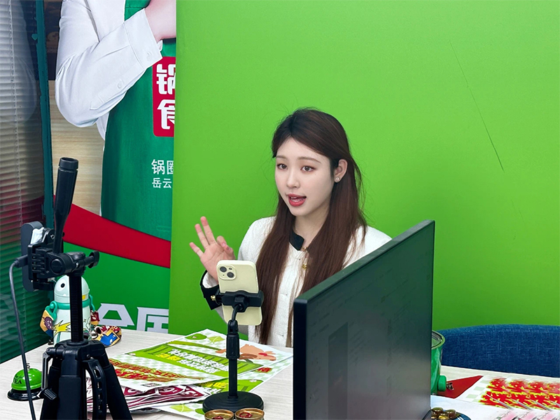 锅圈食汇校园直播间,学生正在直播锅圈食材