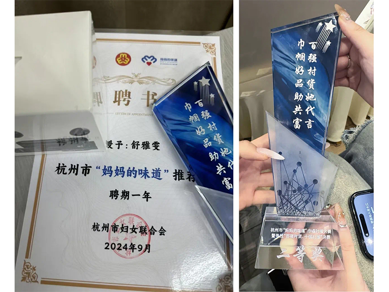 9. 2024年,参加第一届杭州市“妈妈的味道”巾帼村播大赛暨寻找“百强村货、十强村播”直播大赛获二等奖,并被授予杭州市“妈妈的味道”推荐官。