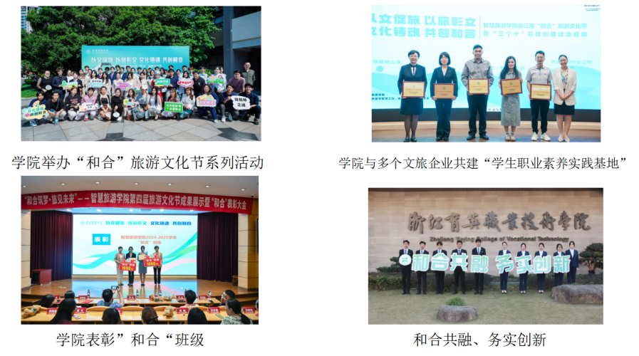 学院以"和合"党建引领"和合共融,务实创新"的旅游院风,通过开展"和合"旅游文化节、班团研学实践活动、表彰会,评选"和合"之星、大使、班级等举措,倡导"微笑、问好、点赞"的"和合文化",并融入学生"第二课堂"职业素养培育和"三个十"校园文化活动中,内塑品质、外展形象,不断强化、巩固旅游学子的精神风尚,形成了校园学生活动的特色品牌。